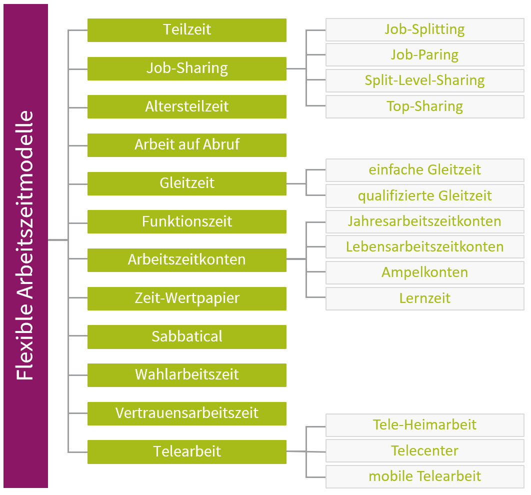 Die bekanntesten flexiblen Formen der Arbeitszeitgestaltung sind unter anderem Arbeitszeitmodelle der Teil- und Gleitzeitarbeit sowie Arbeitszeitkonten, die Vertrauensarbeitszeit und mobile Arbeit. Insgesamt gibt es darunter eine große Vielfalt von Möglichkeiten.